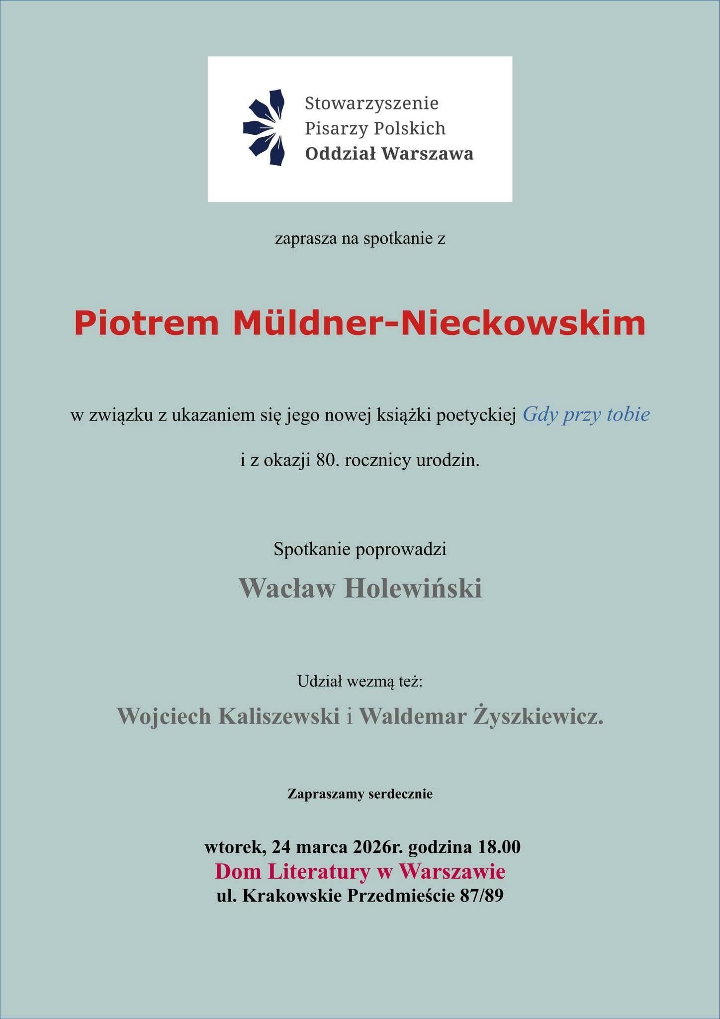 Skontaktuj się z namiStowarzyszenie Pisarzy Polskich Oddział Warszawa ma zaszczyt i przyjemność zaprosić na wyjątkowe spotkanie autorskie poświęcone twórczości Piotra Müldnera-Nieckowskiego – wybitnego poety, prozaika, dramaturga, a także lekarza i językoznawcy, laureata licznych nagród literackich i państwowych, m.in. Nagrody im. C. K. Norwida, Wielkiego Splendora Polskiego Radia oraz Srebrnego Medalu „Zasłużony Kulturze Gloria Artis”.
