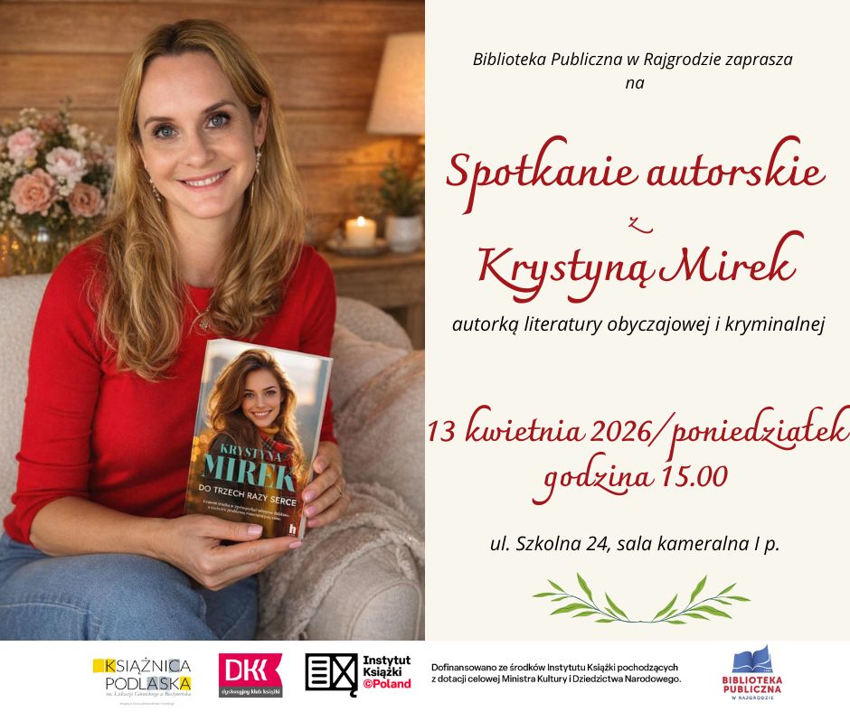 Skontaktuj się z namiBiblioteka Publiczna w Rajgrodzie serdecznie zaprasza na spotkanie autorskie z Krystyną Mirek – cenioną polską pisarką literatury obyczajowej i kryminalnej, autorką blisko czterdziestu powieści, w tym wielu bestsellerów. Wydarzenie odbędzie się 13 kwietnia 2026 roku (poniedziałek) o godzinie 15.00 w sali kameralnej na I piętrze przy ul. Szkolnej 24.