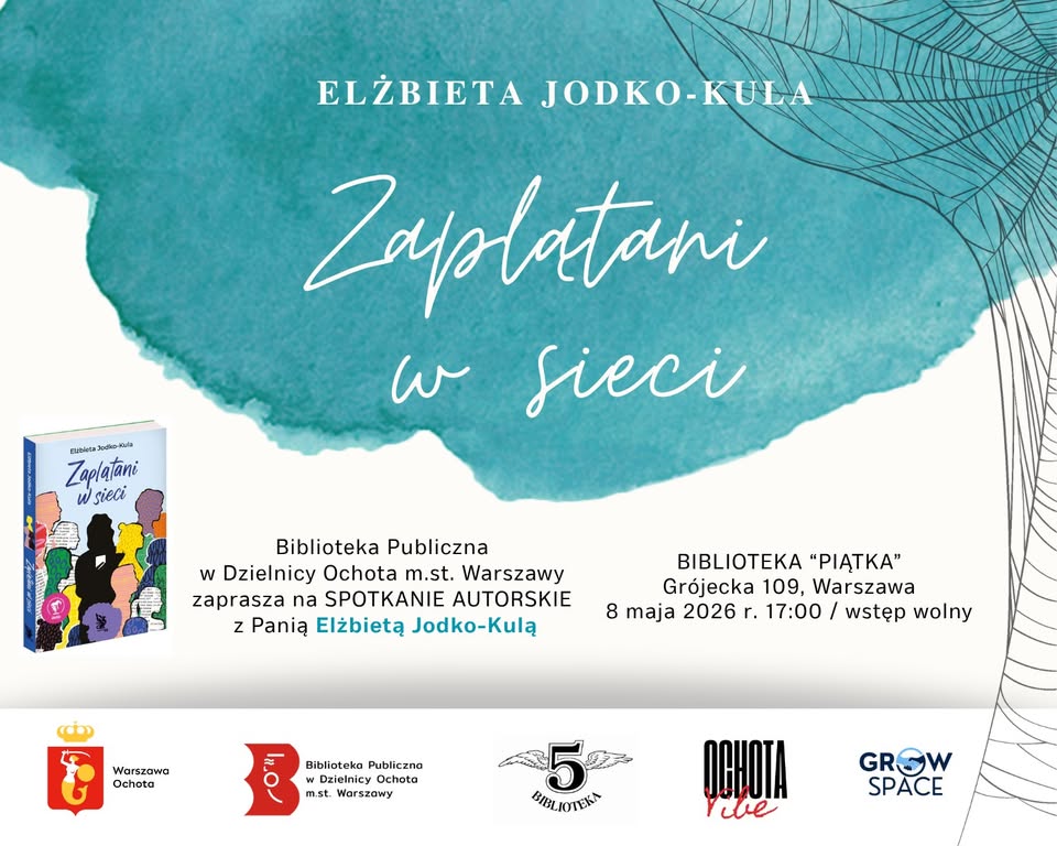 Skontaktuj się z namiBiblioteka Publiczna w Dzielnicy Ochota m.st. Warszawy, Urząd Dzielnicy Ochota m.st. Warszawy oraz Fundacja Grow Space zapraszają mieszkańców Warszawy na wyjątkowe spotkanie autorskie z Elżbietą Jodko-Kułą – pedagogiem, socjoterapeutką i autorką nagrodzonej książki „Zaplątani w sieci”. Wydarzenie odbędzie się 8 maja 2026 roku o godzinie 17:00 w Bibliotece „Piątka” przy ul. Grójeckiej 109 w Warszawie. Wstęp jest wolny, a organizatorzy szczególnie gorąco zachęcają do udziału uczniów, pedagogów, rodziców oraz wszystkich osób pracujących z młodzieżą.