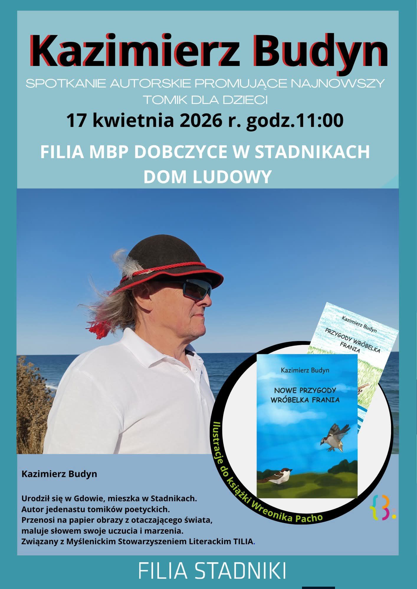 Skontaktuj się z namiFilia Miejskiej Biblioteki Publicznej w Dobczycach w Stadnikach oraz Dom Ludowy w Stadnikach serdecznie zapraszają na spotkanie autorskie promujące najnowszy tomik poezji dla dzieci autorstwa Kazimierza Budyna.