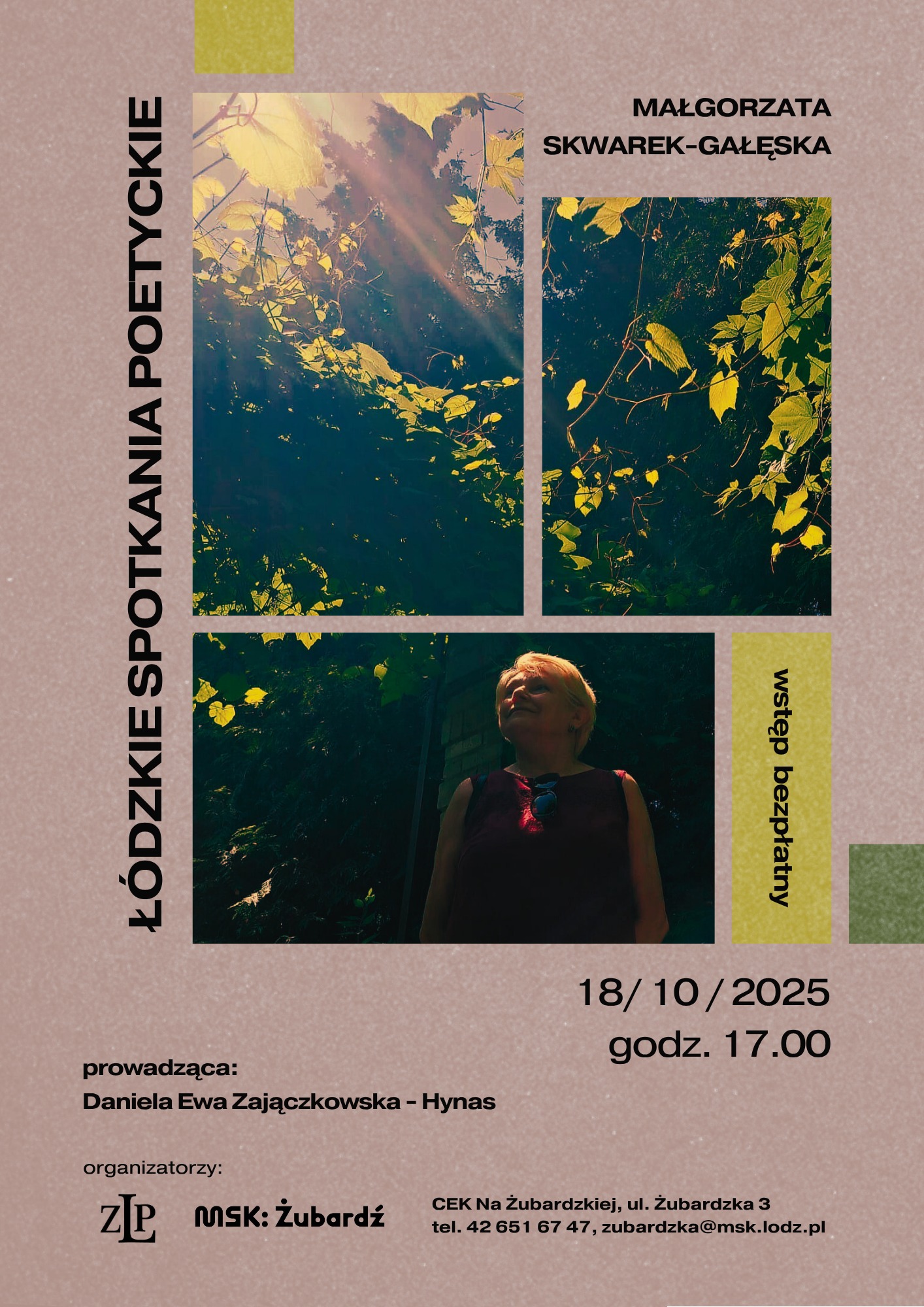 Małgorzata Skwarek-Gałęska – to poetka, animatorka kultury i tłumaczka, której twórczość łączy subtelną wrażliwość, inteligentny humor i głęboką refleksję nad światem. Autorka kilkunastu tomików poezji, w tym takich tytułów jak: